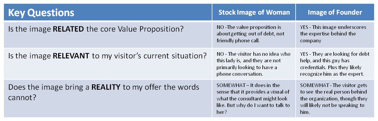Based on the results of this test – and their experience optimizing websites for nearly two decades – Marketing Experiments put together this image assessment grid. It might help you ask the right questions when you’re selecting an image.