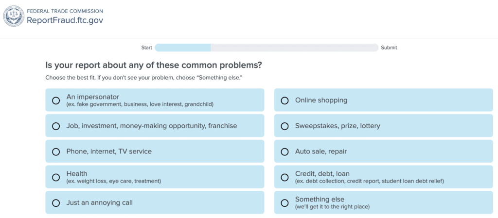 Just go to the FTC’s Complaint Assistant and select the option that applies best to your situation.