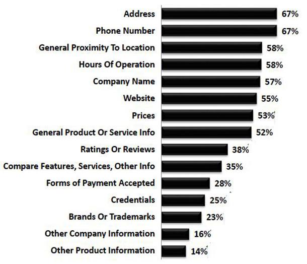 To give you an idea of what kind of information people want to see from a local business, here’s a chart from Local Search Association & Burke Inc.’s Local Media Tracking Study, June 2014. It shows which information consumers want to find out from a local listing:
