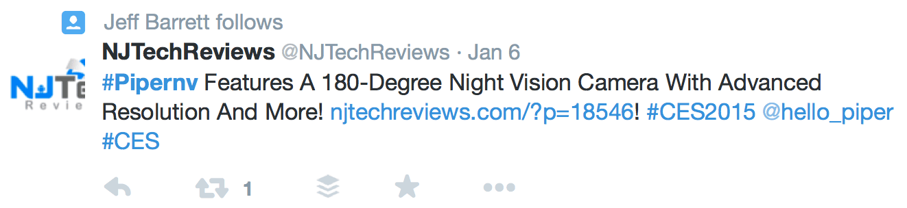 #Pipernv is a product. Notice that the author of the tweet also tweeted at the company with the “@hello_piper” handle. Why do that? Because the company might retweet this since it mentions and promotes their product. The company may also be tracking #Pipernv, and might retweet this just to amplify someone’s positive opinion of their product.
