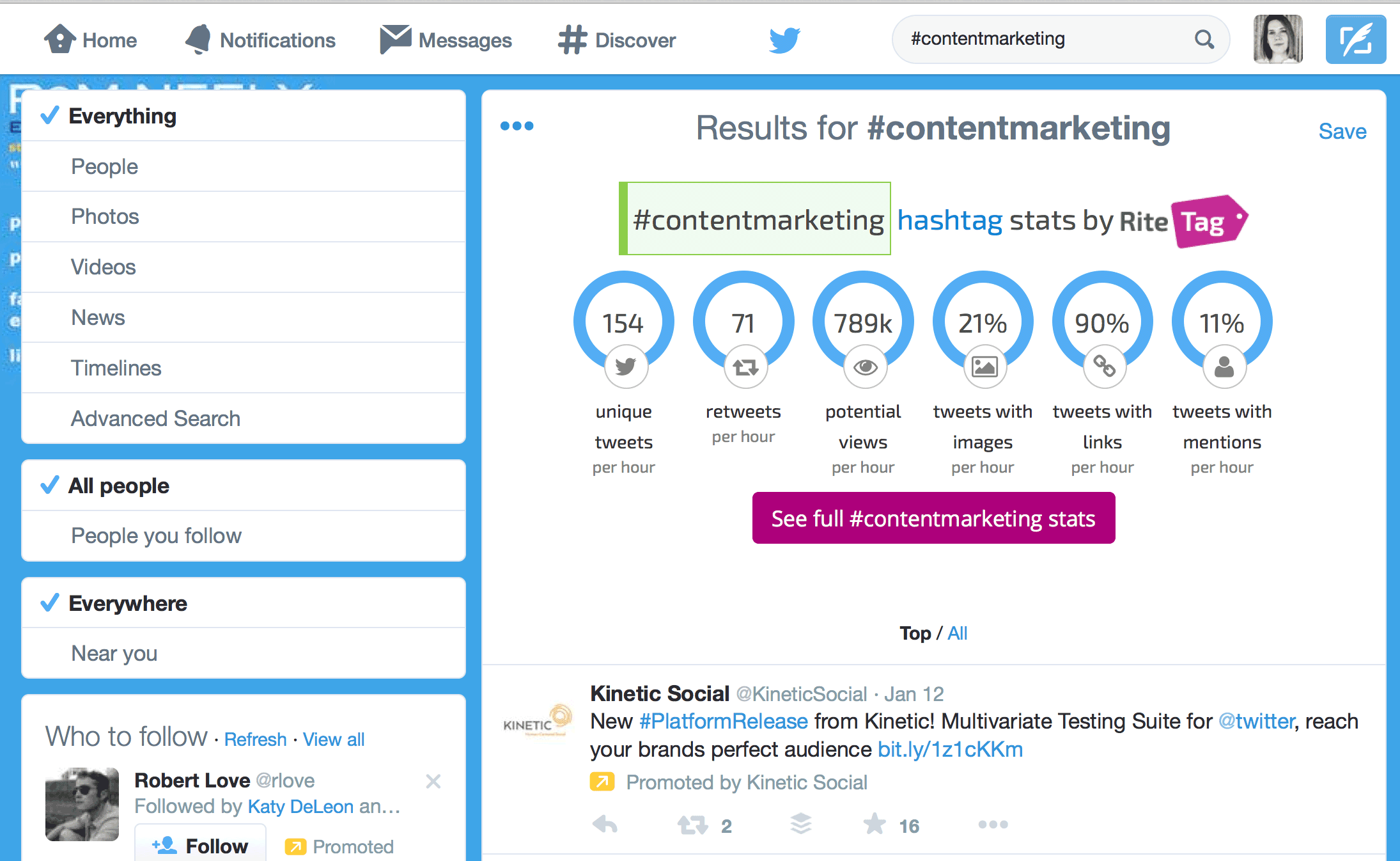 There are so many tools to show you which hashtags to use. If I had to pick just one, it would be RiteTag. RiteTag’s edge is that it can be used via RiteTag’s website, or directly in your browser as an app or plugin. It works with Firefox, Chrome or Safari. RiteTag also works directly in the interfaces of Twitter.com, Buffer, Hootsuite, Tweetdeck, SocialOomph and SproutSocial.