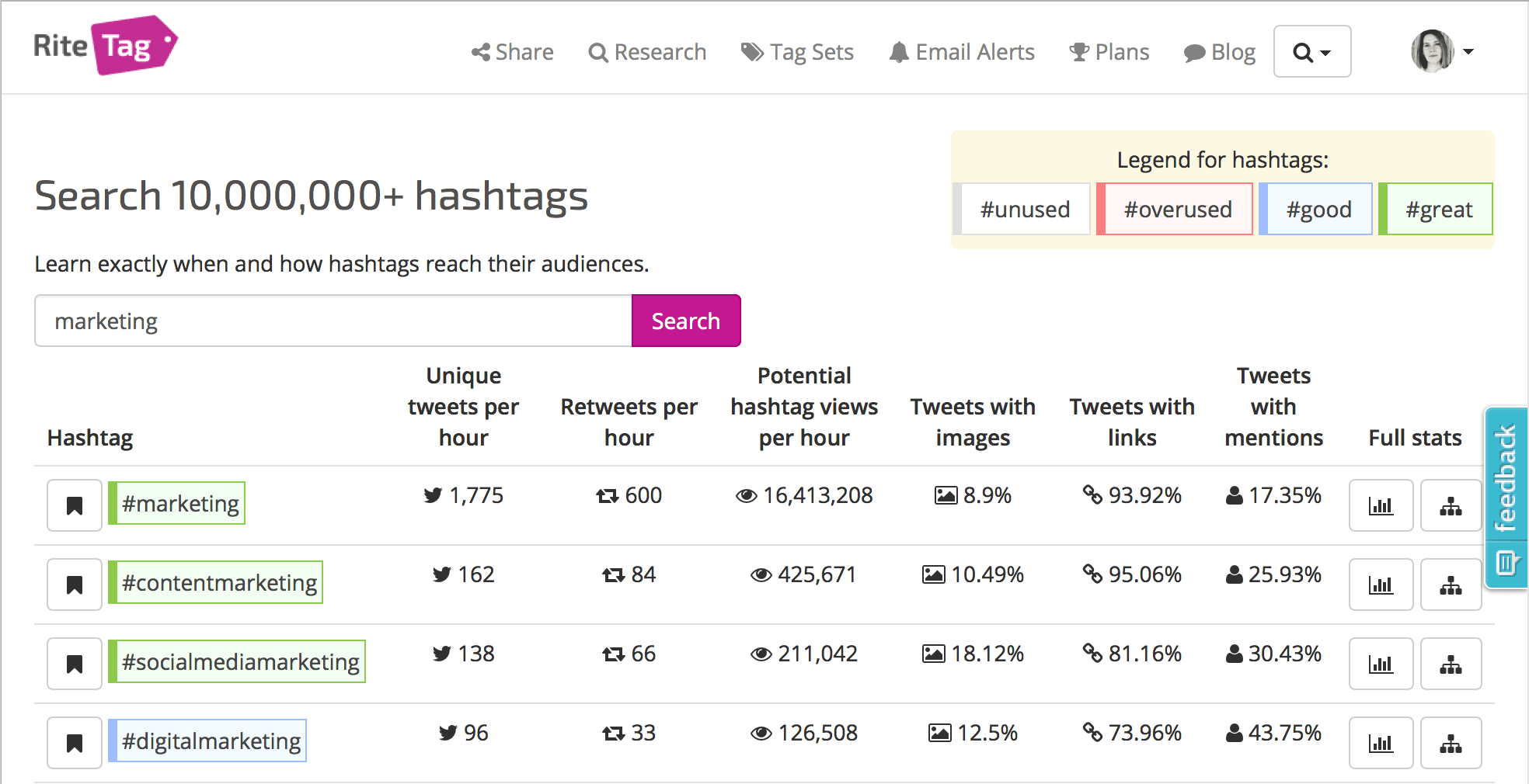 RiteTag also rates hashtags according to how good they are to use. See how “#contentmarketing” is highlighted in green? That’s RiteTag’s visual cue for telling you it’s a good hashtag to use.