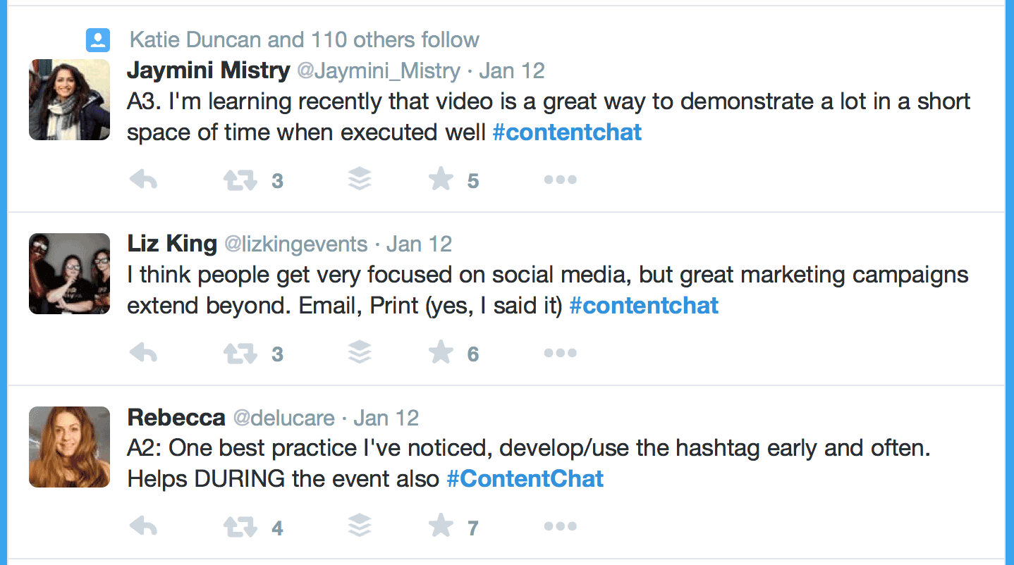 Here are a few tweets from the tweet stream of a recent chat about content marketing: