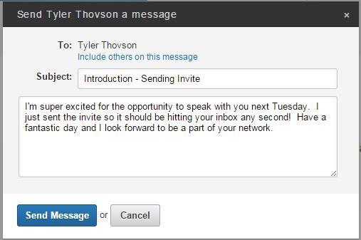 As soon as you set an appointment, have a conversation trying to set an appointment, or get into any scenario that involves the word “appointment,” let the person know you are sending an invitation to connect. This is LinkedIn Connecting 101, but I know many sales professionals who don’t this. Here’s an example of how I send the appointment.