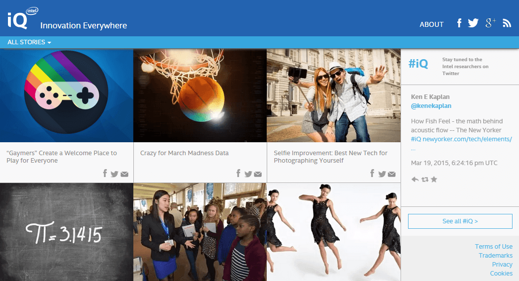 Intel’s iQ project publishes articles that Intel produces and analyzes the content Intel employees are consuming. The result? An engaging tech culture magazine that demonstrates an approachable, human aspect rather than a giant, intimidating brand.