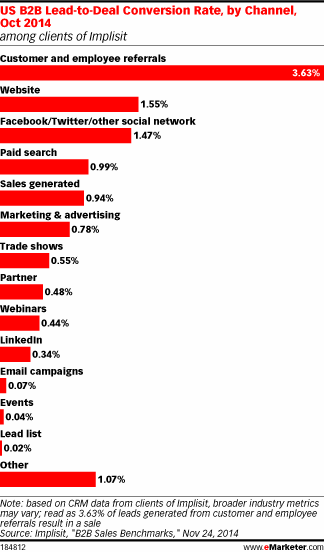 Implisit asked 500 of their US-based B2B clients which channel converted best. Customer and employee referrals got more than double the leads of any other channel.