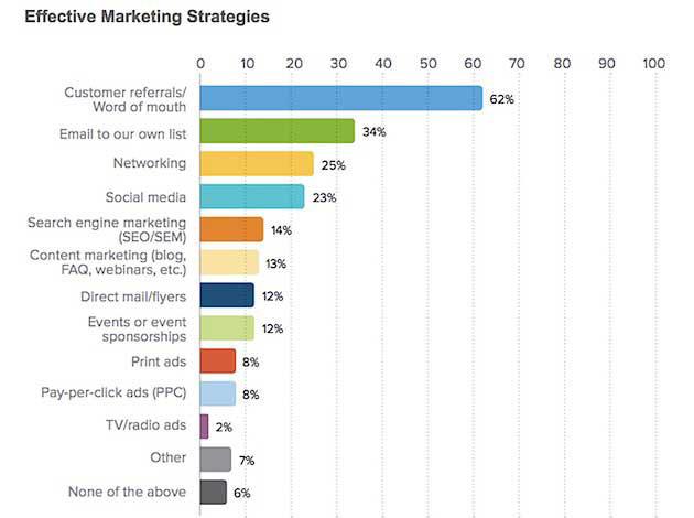 MarketingProfs found that small business owners (50% B2C-focused; 28% B2B; 22% mixed) said their most effective marketing strategy was word of mouth, too.