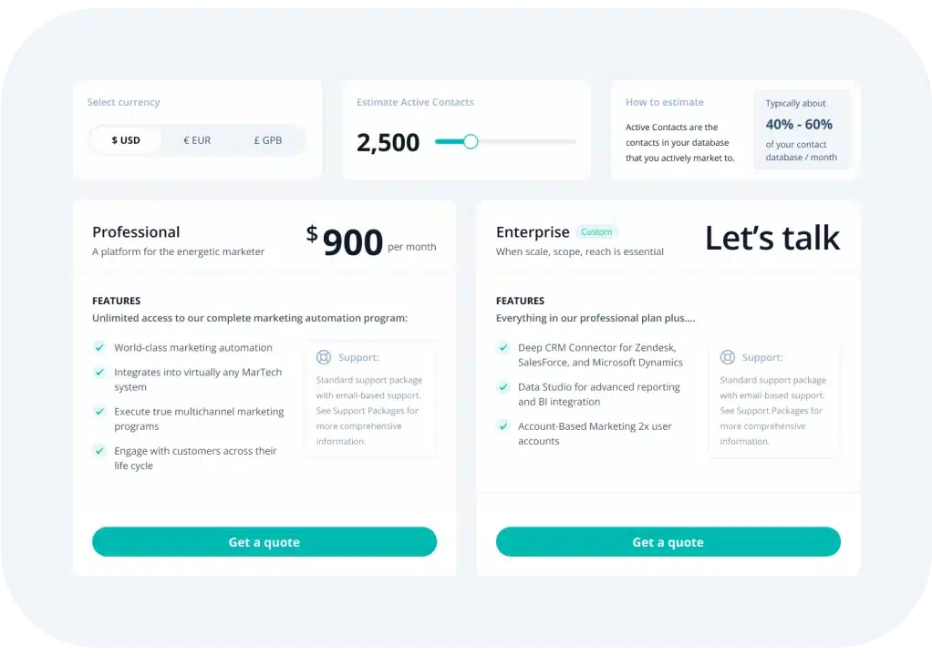 As the last independent B2B marketing automation platform, we work with many vendors across the marketing tech stack. We have deep native integrations with all major CRM vendors, and integrate with 1000’s of solutions through our API, webhooks, shared data lake, and iPaaS solutions. If you’ve got it, we can probably connect with it.